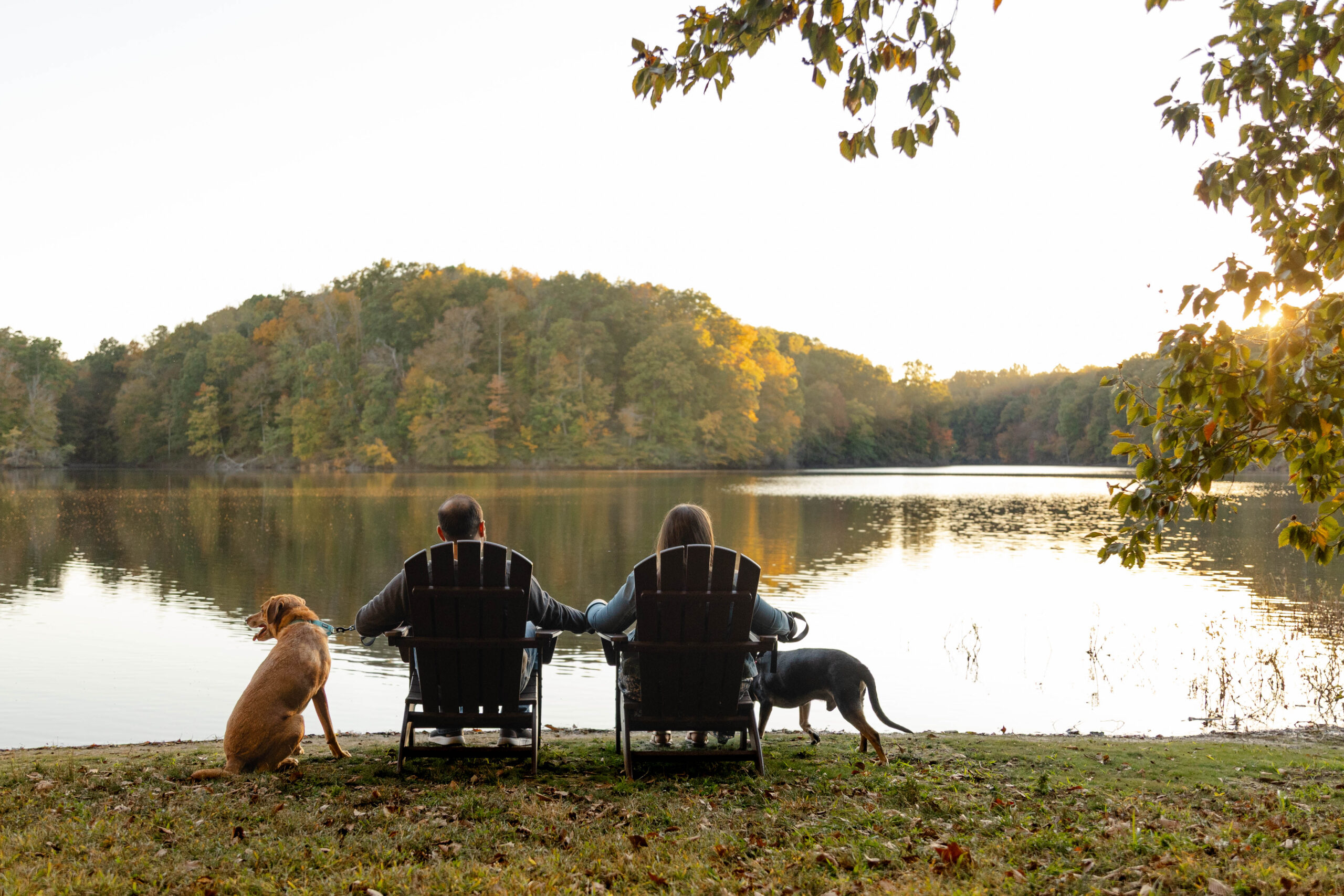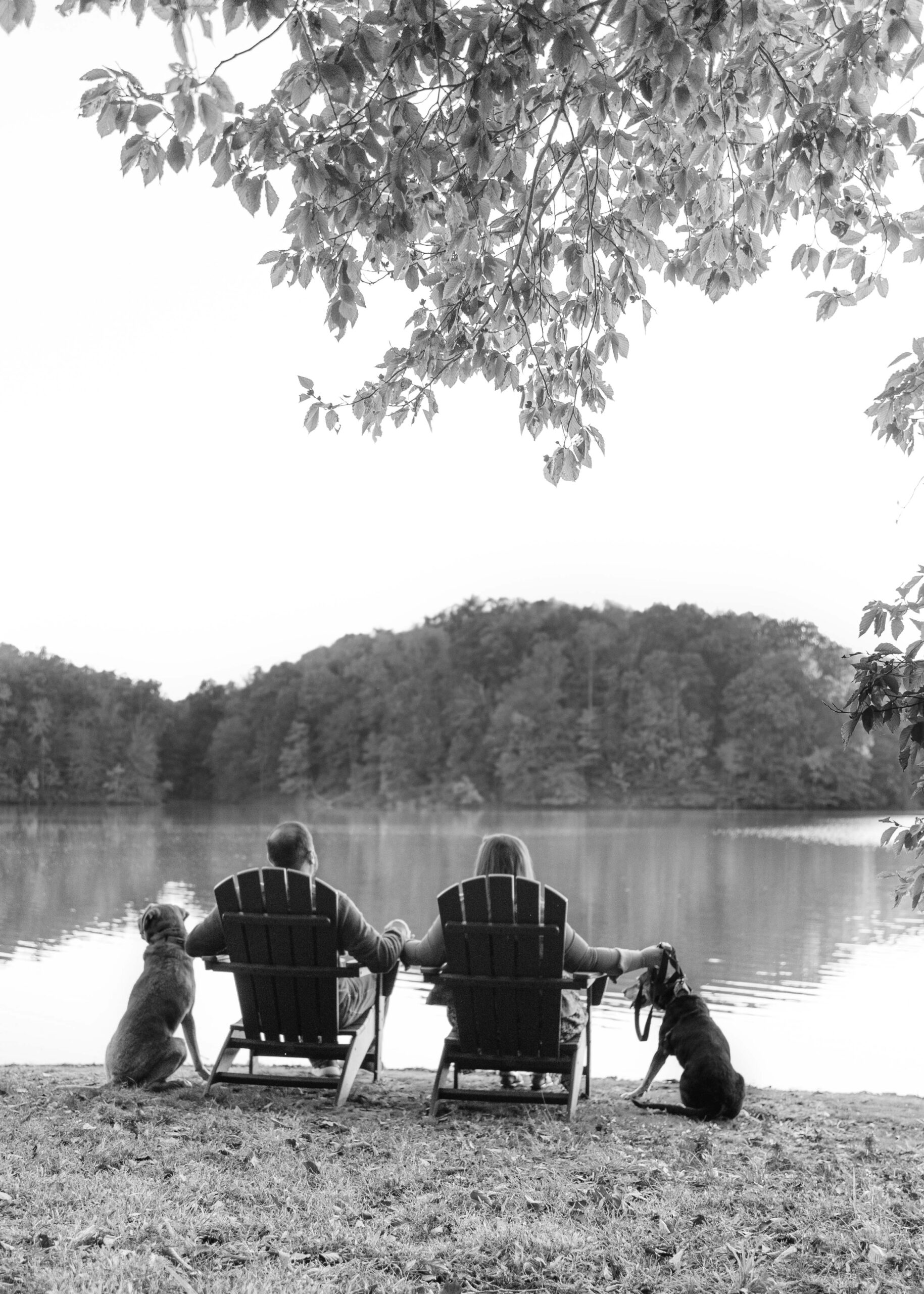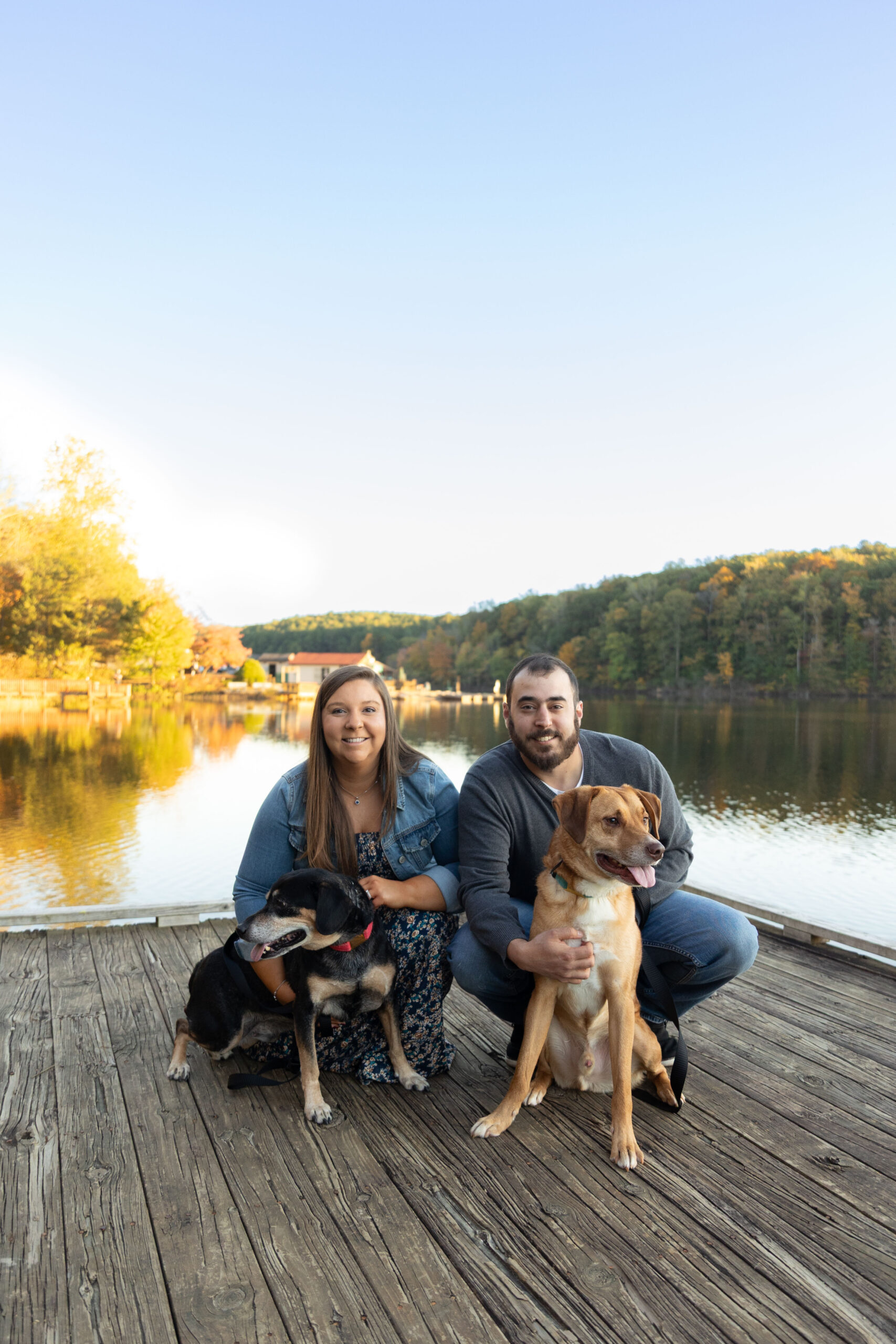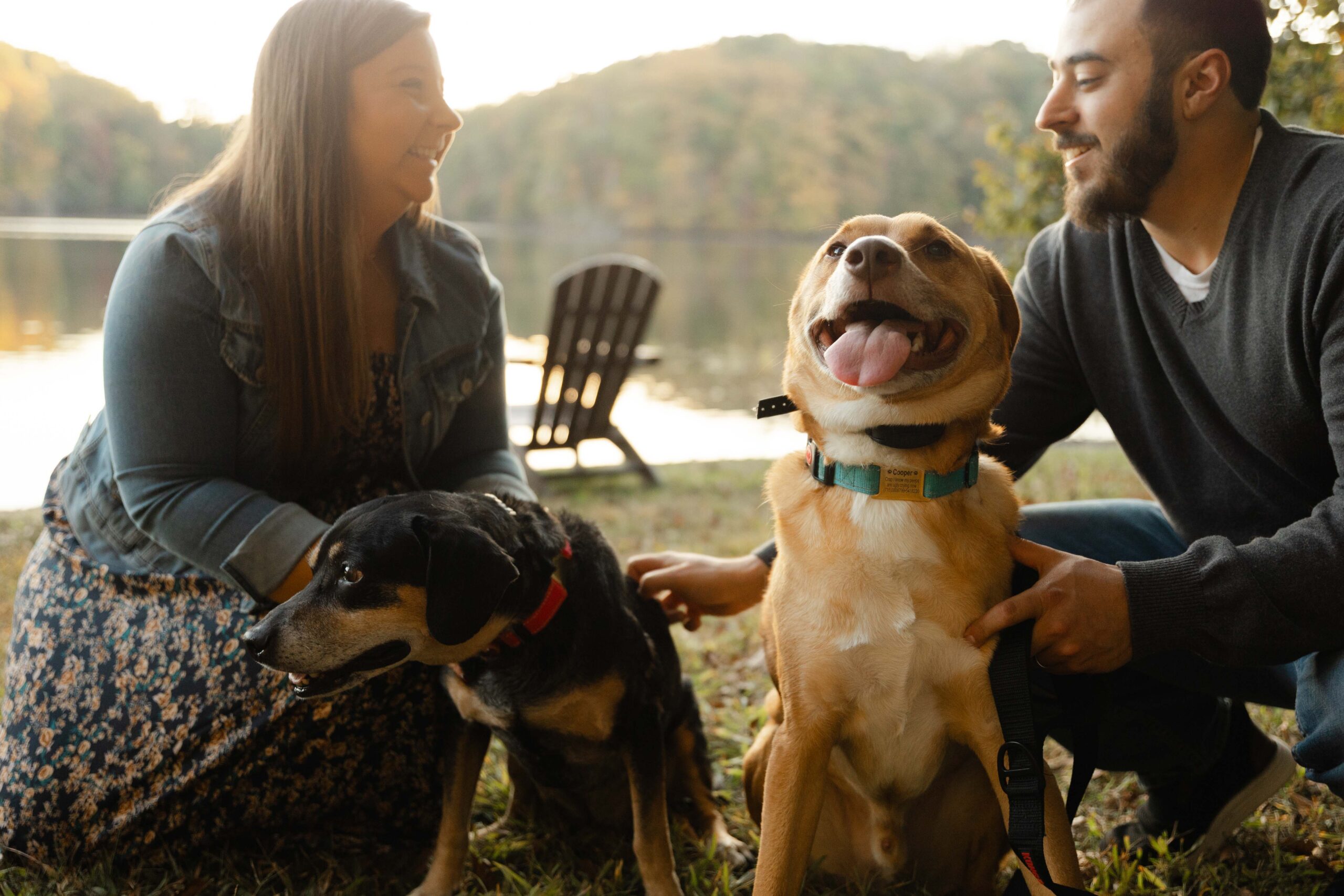 This fun and friendly couple was looking for a chance to be outside in the sunshine with their two beloved dogs and spend time together just being with each other, hand in hand, fingers intertwined, dogs at their feet.